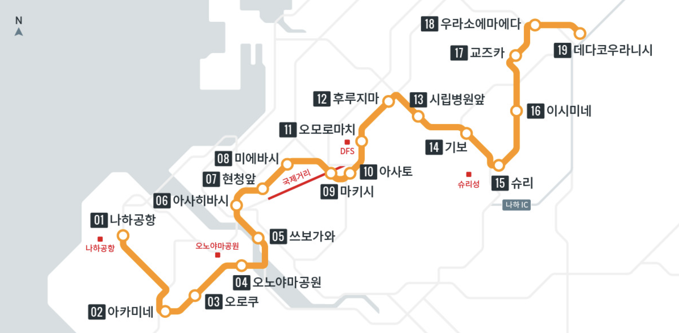국제거리는 현청앞역(県庁前駅)에서, 슈리성은 슈리역(首里駅)에서 내려주시면 바로 가실 수 있습니다.