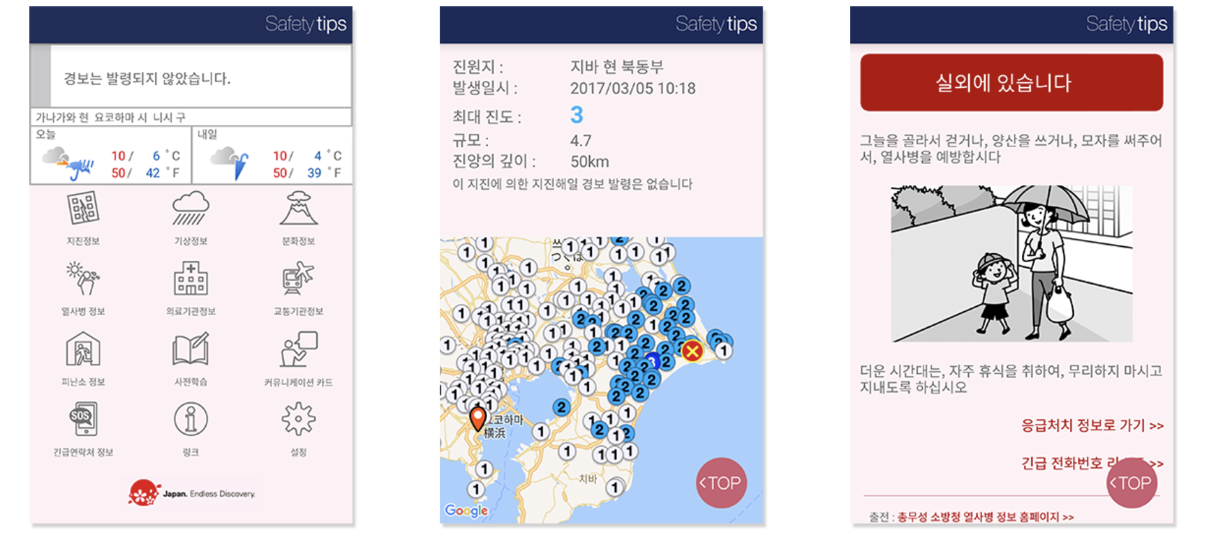 일본 정부 관광국에서 운영하는 Safety tips for travelers라는 앱을 사용하면